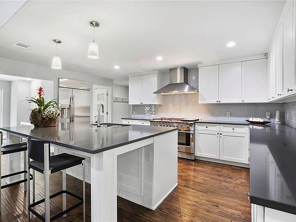 Transitional one story renovated w light & bright amenities.Open concept kit w eat-in island,6 burner gas range w griddle & dbl oven,built-in fridge,quartz & ct.Open to a great oversized room w a lg fireplace & vaulted ceilings.In addition is a private DR & FLR that could serve as an office.Split floorplan w the master & 2 guest bedrooms on one side of the home & a GBR on the other.Each BR has ample storage with WIC & private bathrooms. The laundry room is a generous size w a sink & a waterline for a fridge. Attached 2 car garage with privacy gate and cirlce drive provide ample parking.