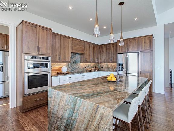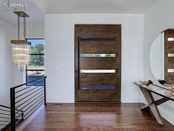 This Comito designed and built contemporary, luxury home resides on a 3.5+ acre site atop the gated Cedar Heights 900-acre development. Enter through the grand 5’x8’ Pivot entry door and behold the most breathtaking views of the front range and Pikes Peak. Floor to ceiling double paned Pella® wood sliders and windows take full advantage of the vistas in every direction. Luxury surrounds you, too, with every surface addressed with oak hardwoods, travertine and Italian porcelain flooring, as well as marble, granite, quartz, and onyx countertops utilized throughout the great room, kitchen, bars and baths. The gourmet kitchen is appointed with top-of-the-line Kitchen Aid stainless steel appliances, including a second refrigerator in the adjoining butler’s pantry and serving area. The kitchen opens to the great room, with soaring 20’ ceilings, an ornate gas fireplace, dining area and an adjacent bar. The infrastructure provides radiant heated flooring, smart devices integrated throughout including a Smart Home Thermostat, Lighting and Media technologies and heated garage, including a pre-wired 220 capability for future garage lifts. The master offers a panorama of the front range and expansive Trex decks just outside. Wake up to the view and the tiled floor to ceiling gas fireplace. The ensuite master design is complete with dual bathrooms, and double vanities. The master bath also features an ergonomically designed Kohler soaking tub, a large walk-in shower as well as a separate water closet. Just off the master bath are two large walk-in closets, finished with thoughtful built-ins, and large windows illuminating the rooms, and your wardrobe. Downstairs is the family room, and a large office and library. Down the hall is a large utility room, and two more ensuite bedrooms for family and guests. Both spacious, with more views, lower deck access and richly appointed bathrooms with granite counters, subway tiling and Kohler fixtures. List of features is available.