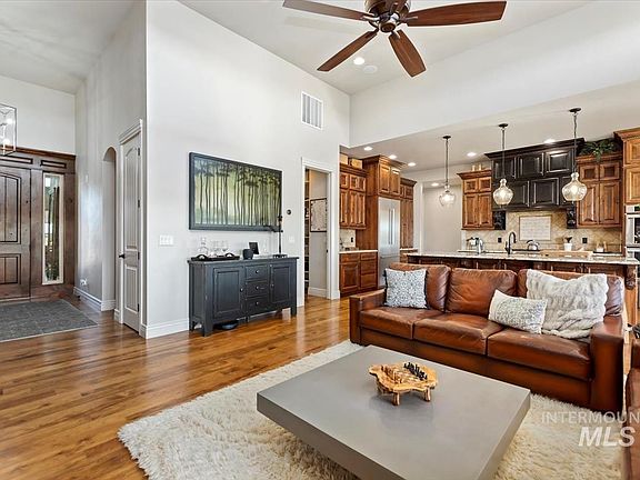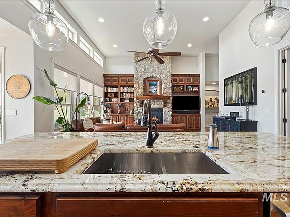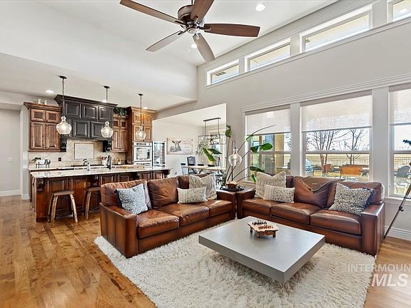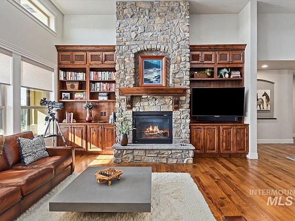 Immaculate one owner home built by Shadow Mountain, located in Bella Terra, a premier community in Eagle, Idaho. Feel the warmth of this single level home as you step into the entryway which leads to the perfect open floor plan. Amenities include, Thermador appliances, a walk-in pantry, double oven, built-in gas range, granite countertops, hardwood floors, large living room with fireplace / dining area that opens to a covered patio with a built-in barbecue & island. Enjoy the backyard landscaping which includes a fire pit & putting green. The primary suite has an outside entrance, a double vanity & customized oversized walk-in shower! Two additional bedrooms & bath are down the hallway while the final bedroom is on the opposite side with full bath & laundry room. The 3 car garage as well as the entire home has been well maintained. Paid for solar panels reduce the electricity to less than $6 a month. The common area includes a pond, clubhouse, pool, fitness center, & walking paths.