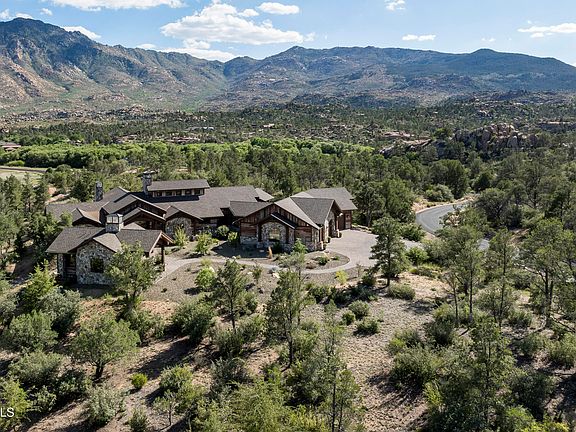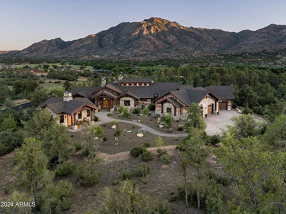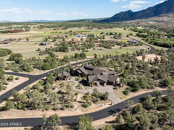 Exquisite Mountain Ranch Estate, perfectly positioned on 1.87 acres at the base of Granite Mountain, behind the gates of exclusive American Ranch Equestrian Community. Architecturally wrapped w/ reclaimed barn wood siding & stone exterior, this 4,369 sq. ft. estate is stunning inside & out! Main house offers 3 bed plus office, 4 bath, boasting only the finest of features w/ floor to ceiling double sided see thru stone Accucraft fireplace, arched beams w/ wood ceilings, milled live edge wood accent walls, built in custom cabinetry, custom Wyoming lighting, Kolbe windows & sliders, solid alder wood doors & trim, whole house sound system, heated tile flooring, accent tin ceilings, Nuvo water filtration, fire suppression system, hickory hardwood flooring w/ brick & stone accents See MORE. throughout. Chef's kitchen is equipped w/ oversized black walnut island, copper sink & range hood, Wolfe/Sub Zero Appliances w/ 6 burner range & griddle, pot filler, double oven, walk-in pantry w/ wine storage. Expansive primary suite w/ quaint reading niche & cozy fireplace, huge walk-in closet w/ granite counter built in dresser. Grand primary bathroom offering walk-in thru shower, copper soaking tub & sinks. 555 sq. ft. Guest House is adorned w/ the same attention to detail offering kitchen, den w/ see thru fireplace, 1 bed, 1 bath. Oversized 3 car garage w/ epoxy floors, climate control, walled in storage room & upstairs loft. Enjoy captivating mountain views from wrap around rear patio all under roof w/ wood burning fireplace, built-in BBQ, water feature, fenced yard for pets, & spa connection off primary. Community offers clubhouse, outdoor pool, tennis courts/pickleball, fitness center, cardio room, billiards room, fully stocked fishing lake & the multi-million dollar fully staffed equestrian center and more!