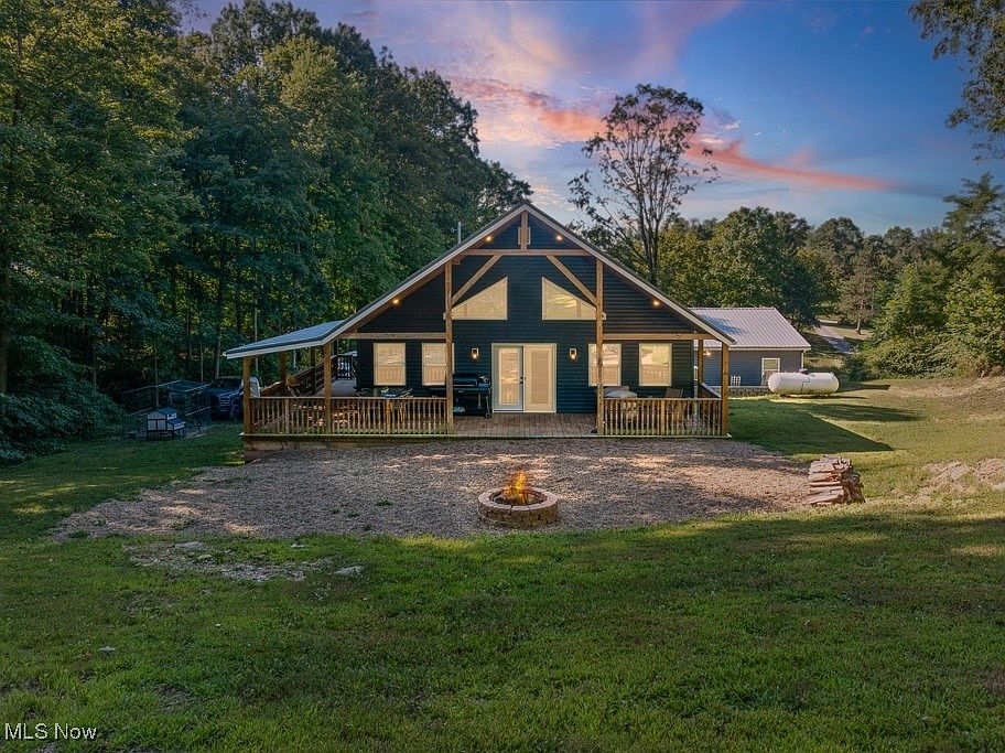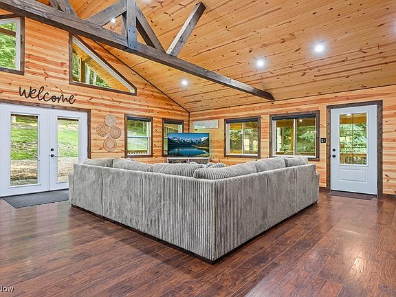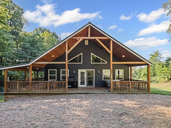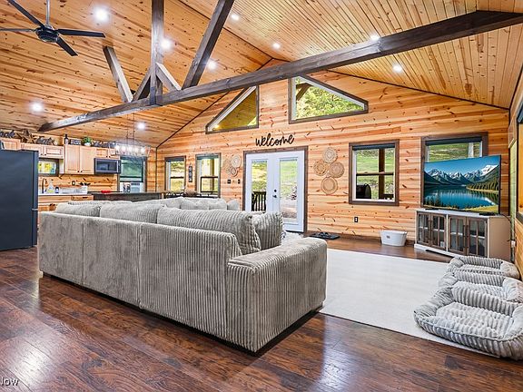 Welcome to your own private paradise. Built in 2019, this one-of-a-kind A-frame style ranch with a walkout basement sits on 3.58 scenic acres. The property features a serene backyard pond with a stunning rock wall and a wrap-around covered porch with recessed lighting, perfect for relaxing or entertaining. Inside you will find an open concept floor plan with vaulted ceilings, exposed wood beams, and abundant natural light. The kitchen offers quartz countertops, a large island, and plenty of space for gathering. The loft provides a versatile area that can serve as a third bedroom, office, or hangout space. The main floor includes the master suite with full bath, as well as an additional bedroom and full bathroom. The oversized garage is finished and designed for more than just parking. It includes a bar, pellet stove, 125-amp service, concrete floor with drain, and ample space for projects or entertaining. Additional features include a spray aeration system, propane furnace and stove with the remainder of the home powered by electric. Mineral rights do not convey with the property. This home offers the perfect balance of peaceful country living and modern comfort. Do not miss the opportunity to call it yours.