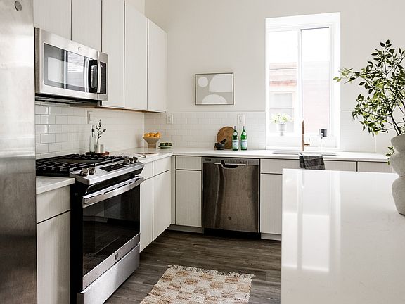 This airy modern two-bedroom/two-bathroom condo is located in the heart of Detroit's tree-lined historic Woodbridge neighborhood. This sun lit, minimalist interior is pristine throughout with a spacious, open-plan layout and nine-foot ceilings. Front and back balconies add additional outdoor space. The glamorous all-white kitchen boasts an island, quartz countertops, and new stainless-steel appliances; the washer and dryer are conveniently tucked into hall closet nearby. The two beautiful bathrooms feature black hexagon tile floors, glossy white subway tiles and all-new contemporary fixtures with an oversized walk-in shower with dual shower heads in the ensuite bathroom.Quiet rear balcony is generously sized and covered for all-season enjoyment. One-car garage, secure street entryways, and a serene residential neighborhood but close to Wayne State campus and the lively Midtown restaurant scene. Pets are negotiable - Immediate or an August move in date.