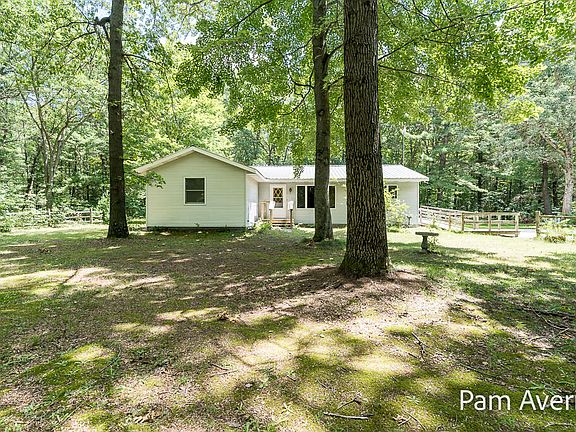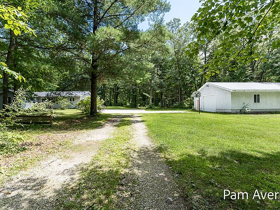 Looking for that Wooded, Private Setting with Acreage and a Super Sized Garage? This one is for you. Three bedroom two Full bath home surrounded by woods and Wildlife. The home has a metal roof, maintenance free deck, furnace (2022) and huge concrete driveway for lots of guest parking. The detached garage is four cars plus (32' x 40') and includes an air compressor and work bench. The shed also has electric attached. The woods previously had several trails that can be regenerated for your recreational fun! This 10 acre parcel backs up to Stonegate Golf Course. Natural Gas is available at the street. Don't miss out..