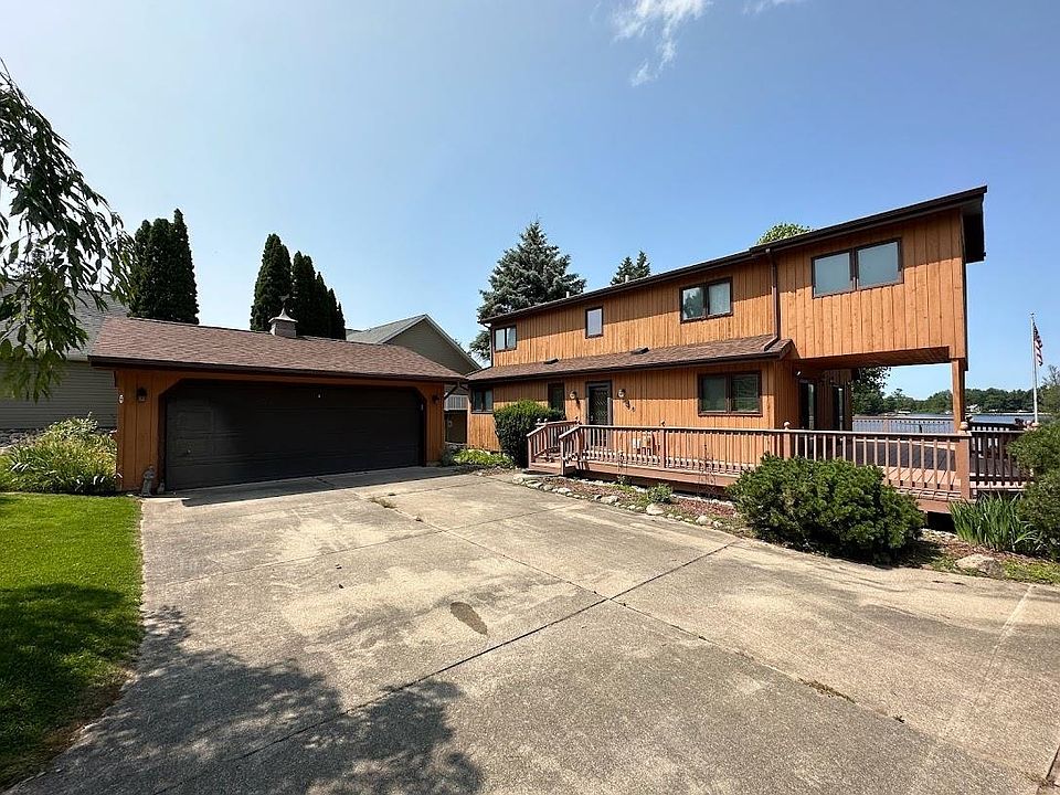 Wow, what a beautiful view! Lakefront living at its finest. Fall in love with this all-sport Lake Lancer waterfront home. Charming and inviting with a naturally lit open floor plan that is both peaceful and relaxing. The vaulted living room with its generous wood ceiling offers large windows with amazing views in each. This 3 bedroom, 3 bath home comes with a walkout basement, additional kitchen and family room in the basement, walking out to a covered porch and lake frontage. The main floor has 1 bedroom with an attached bathroom, living room, kitchen, and dining room with a gorgeous view of the lake. The beautiful wood stairs take you upstairs to the balcony with skylights. From the balcony you have access to 2 bedrooms and a full bath. One of the bedrooms is the size of 2 bedrooms and has beautiful views of the lake. You can get up with the view of the sunrise and end the day with the sunset right from the room. The wrap-around deck with a view of the lake is breathtaking. You can access the deck from the living room and kitchen. The living room, kitchen, and dining room are connected with a view of the lake. The kitchen comes with an island and stainless steel appliances. The house updates include a new roof(2020) wrap-around deck(2022), water heater(2022), dock(2020), and sprinkler system. The home comes with nice water frontage to play games and enjoy family time around the fire. The home is even nestled in a quiet, no-wake swimming area for safety and tranquility. Lake Lancer is a large all-sports lake where you can enjoy fishing, tubing ,swimming and skiing. Sugar Springs is a delightful northern Gladwin community, offering numerous social activities, a salt water indoor pool, golf courses, restaurants, two all-sports lakes, a gym, tennis courts, and even a landing strip. Whether you need a primary or a retirement home, this residence will meet your needs. Memories at Lake Lancer last forever!