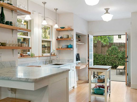 Charming 1910 Craftsman Bungalow rich w/historical details, elegant updates & alluring backyard retreat. Sumptuous light-filled interior filled w/gleaming original woodwork, new fir floors, & high-quality fixtures & appliances throughout. The heart of the home is the chef's dream kitchen that boasts Carrara marble countertops, live-edge shelving, a Subzero fridge, PLUS amazing vintage Wedgewood stove. French doors open to an expansive patio. This open-plan jewel box lives large & well!