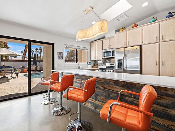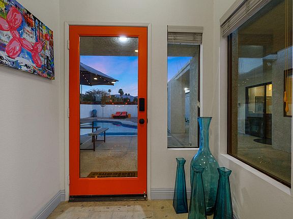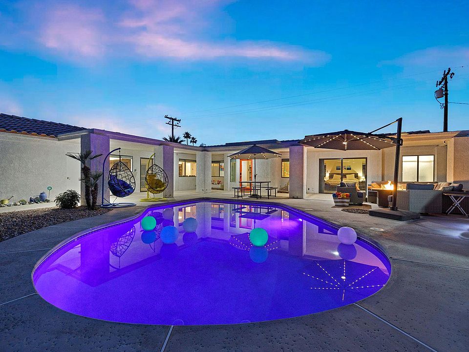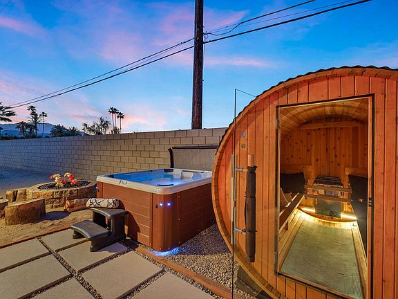 INTERIOR This home enters from a private gated courtyard featuring a gorgeous pool, outdoor dining, section seating with fire feature and multiple sliders accessing the home. The living room features an open floor plan with ample natural light. The living room, dining room and kitchen are open with ample seating for meals with your loved ones. Kitchen features ample storage space, and is fully stocked for your meal prep needs. The breakfast bar seats four and is ideal for morning coffee, dining table seats 8 comfortably. Watch your favorite shows, sports, movies or listen to music on the 60in. Smart TV. Turn on the fireplace on the cooler nights for a relaxing evening. Located down the hall is an amazing TV Room. The TV room features an 86in. Smart TV, ample recliner sofa and best of all large sliders for noise reduction. The property features a two-car garage with TESLA EV charger and a full-size washer and dryer off the kitchen. SLEEPING QUARTERS Main bedroom features a king bed, nightstands, ceiling fan, specious closet, a 42in Smart TV, and an ensuite bath. The bath features dual sinks and a shower tub combo. The large sliding door allows ample natural light and easy access to the pool area. The guest bedroom is located down the hall, features a king bed, ceiling fan, nightstands, dresser and a large closet. The guest bedroom shares the hallway bathroom with shower tub combo. The top secret bedroom is hidden behind the living room cabinet. This sacred bedroom features a queen bed with foam mattress, ceiling fan, 55in. SmartTV, and a large closet. EXTERIOR The front private yard features amazing mountain and palm tree views! Outdoor dining table features dining for eight. The BBQ island is ideal for the grill masters. Ample countertop space and five burners is ideal for an awesome BBQ. The outdoor sectional with fire future is ideal for watching sunsets. Enjoy a late afternoon cocktail while watching the sunset over the mountains. Located on the side of the home adding more privacy is a 4-person above-ground spa and a sauna. The private side yard offers a small fire feature as you enjoy the privacy and focus on your health. For those who cannot sit still, bean bag toss and bocce ball are a great way to spend quality time with your loved ones. Please note the egg chairs and hammock will not be present for guest use. RULES Minimum Age to rent: 25 years old. No Pets, No Parties, No Smoking. For Cancelation Policy please refer to the Rental Agreement.