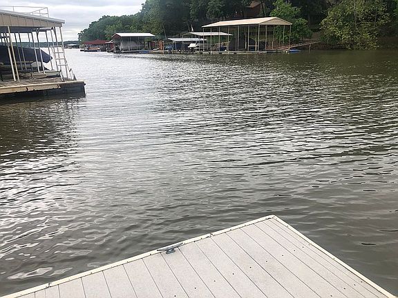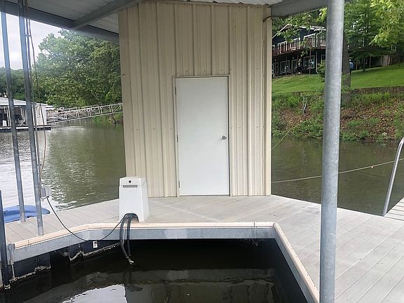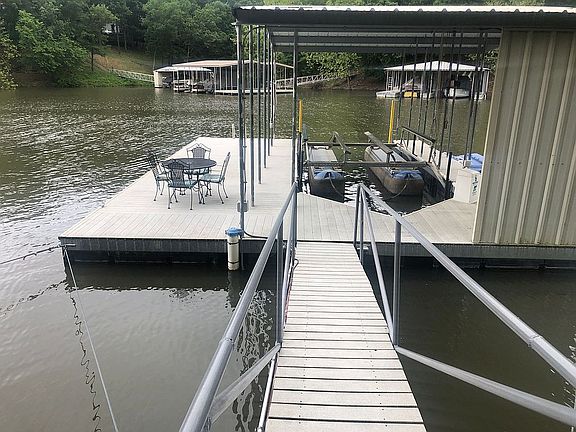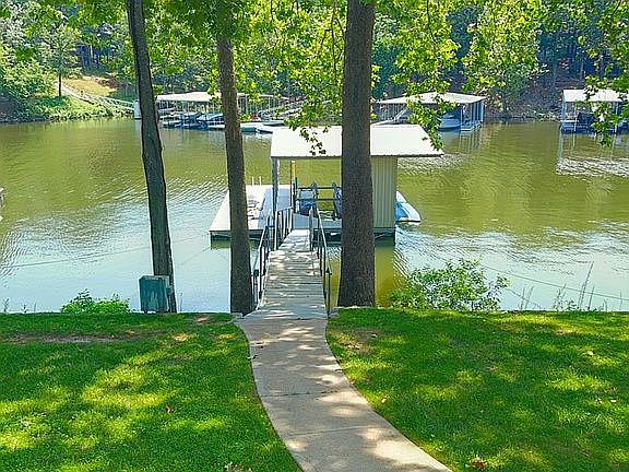 Beautiful lakefront home with wood floors upstairs, two fireplaces and a large covered deck that is perfect for family enjoyment. Lot has a gentle slope to the water. Plenty of parking in the driveway and above the 2 car garage. Single slip, deep water dock with Hydrohoist boat lift and two Hydroports for personal watercraft. Located in a gated community with access to a clubhouse, pool, tennis courts and boat ramp. Great neighborhood and wonderful neighbors. Can be purchased fully furnished and ready to move in!