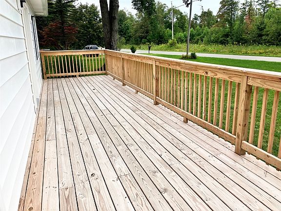WOW! Completed remodeled, cozy bungalow on a quiet street with one-car detached garage. Completely new interior, new roof,and new, expansive deck with gates for pets and kids. New furnace, hot water tank and well pump with new plumbing throughout. Absolutely stunning bathroom with tiled walls and shower surround. The completely new kitchen has all new cabinets and butcher block counter tops along with new sink, faucet, electric range and built-in microwave above range as a space saver. Must see!
