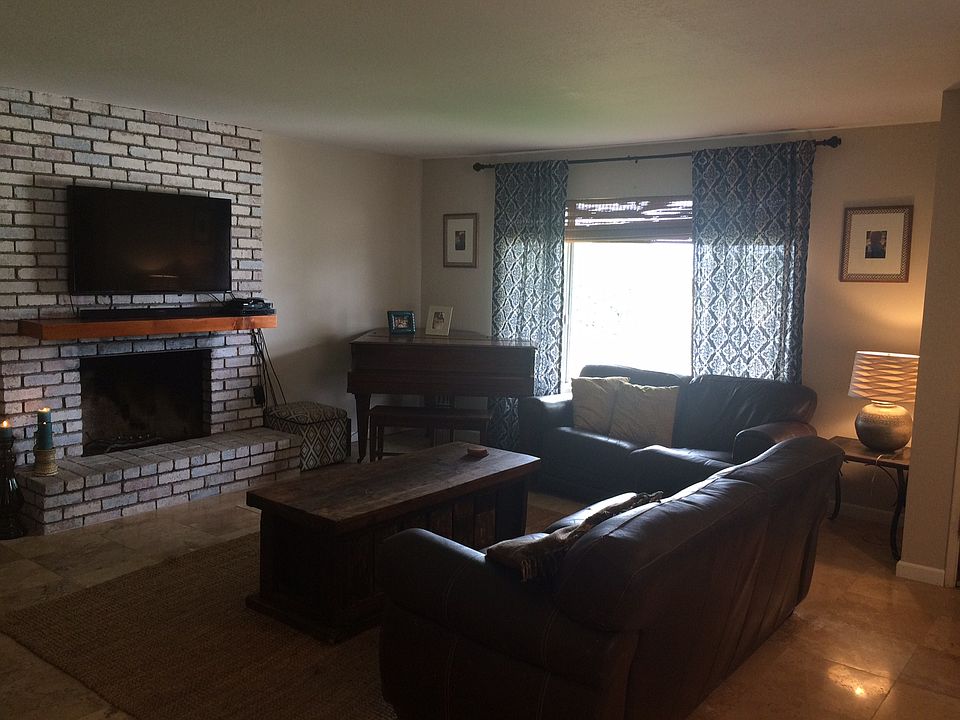 What a great house for entertaining! Open concept kitchen/dining/living area with contemporary brick fireplace; swimming pool, hot tub, fire pit, large lot, no homes directly in front or behind! Master bedroom has en suite and beautiful new hardwood floors; secondary bedrooms have carpet; travertine floors elsewhere. Newer windows, interior and exterior paint, driveway and landscaping. Home Warranty for buyer which includes pool coverage! Easy freeway access. Close to shopping and entertainment.