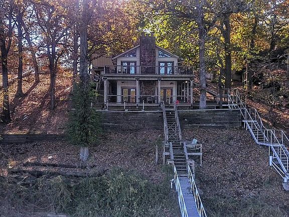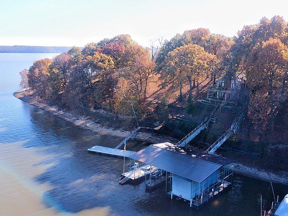 Luxury lake home w/ guest quarters in Gran Tara at Grand Lake! 70 ft lake frontage, 2 slip covered dock, 2 living areas each w/ deck & fireplace. Gran Tara features a secure gated entry, boat ramp, club house, tennis court, swimming pool, & boater's dock.