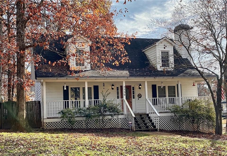 Amazing find in Sugar Hill! Home being sold AS-IS; Cape Cod with master bedroom on main! Two large guest bedrooms and vaulted bathroom upstairs; Main floor has large master suite, laundry room, guest bath, lovely stone fireplace in family room; light and bright kitchen with lots of counter space, tall solid wood cabinets, and under-cabinet lighting. Basement has oversized two-car garage with lots of room for workshop needs. Partially finished half-basement offers space for office, play room, gym, etc. Fenced and flat backyard. Gorgeous long rocking chair covered front porch! Needs repairs to exterior trim and master bathroom. Great value! Price is reflective of needed repairs.