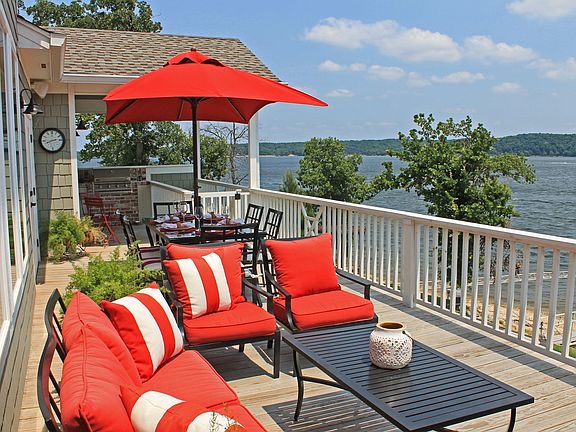 Straight from Coastal Living Magazine right on Grand Lake! Too much to list it all! Charming courtyard entry, 7/8 BR, 6 BTHS, 2 living areas, 2 FP, 2 wet bars, commercial appliances, stone counters, furnishings/appliances stay! Game room + wet bar & great outdoor living space + lakeside Jacuzzi. 4 car garage 2 attached/ 2 detached. 30 ft. boat slip + did I mention stunning views? Office on main floor w/ separate entry. Dog room off living area w/ hidden access through closet. Lower level offers 2 beds/2 bths w/ washer/ dryer + kitchenette area. Space underneath stairs for wine cellar. 3 bedrooms upstairs including one w/ built in bunks! Outdoor storage closet for water toys, etc. Lot offers gentle slope to water + home is located steps away f/ dock. This home is a MUST SEE!