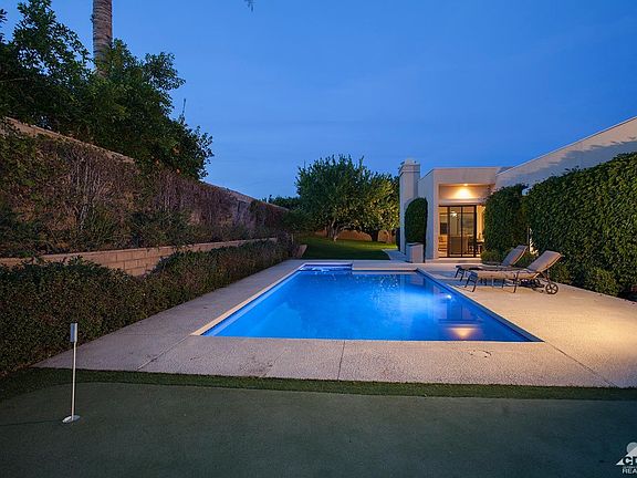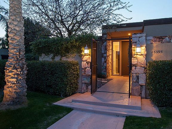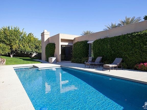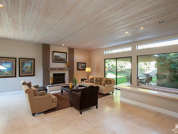 Custom desert contemporary residence in Indian Wells. Perfect for full time or vacation living. Soaring wood ceilings in open living room area. Beautifully remodeled with Travertine marble flooring. 4 bedrooms each with their own bathroom with wonderful privacy and all with hard wood flooring. Large master suite with french doors with 2 separate walk in closets. Master bath with dual sinks, vanity, separate shower and tub. Gourmet kitchen features slab granite with a large built in Subzero refrigerator and separate freezer. Updated stainless appliances with double ovens, cook top and new dishwasher. Exterior custom electric shutters for master bedroom and one slider in living room for energy efficiency. The perfect backyard offers lush landscaping and citrus trees and covered patio for outdoor dining and BBQ's. Remodeled Pebble Tec pool finish in 2016 with LED lights and smart remote system. Wonderful southern mountain views. IW residents enjoy great benefits, inquire at City.