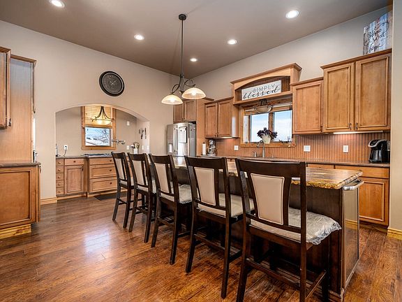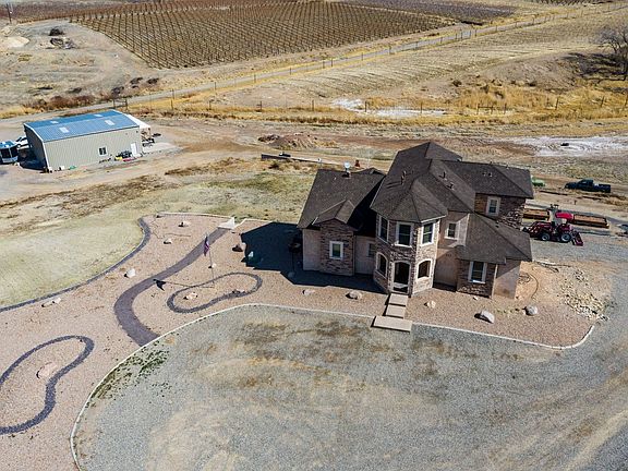Beautiful 4,600+ sq ft custom home on 16.48 acres. This one of a kind home was constructed with Insulated Concrete Blocks and has custom upgrades throughout. The foyer leads to an open floor-plan - kitchen, dining room, and very large living room. The kitchen is a beauty with stunning granite counter-tops, custom cabinets, and a 5-burner gas stove in a window nook with a pasta faucet. The rest of the kitchen features a wine and beverage cooler, wall oven/micro combo, large island, and walk in pantry. The spacious living room features high ceilings, with views of the mountains, orchards, and vineyards. Two bedrooms on the main floor share a jack-&-jill bath. Upstairs is a private primary suite with more beautiful views. There are 2 separate walk-in closets on the way to a private sitting room/office/nursery/bedroom. The 5-piece master bath has a corner garden tub with windows for amazing views while you soak. The walk-out basement has 12-foot ceilings with weight room, office or theatre, and family room/game room. There is plenty of room for a 2 more bedrooms or guest suites and a kitchenette in this area. Part of the basement was previously a mother-in-law suite and the plumbing is still in place to convert it back by adding a kitchenette unit. There is a private entrance for the walk-out basement. The deck off of the dining and living room areas is secluded and stairs go down to a large fenced yard. There is also a 2,000 square foot metal building on the property that can be built out as a 4 Bedroom ADU/used as a garage/Shop. Approved plans available. Electric service and water tap already in for this ADU build out. The views are something to be experienced at this home! Buyer to verify all info. All info subject to error.