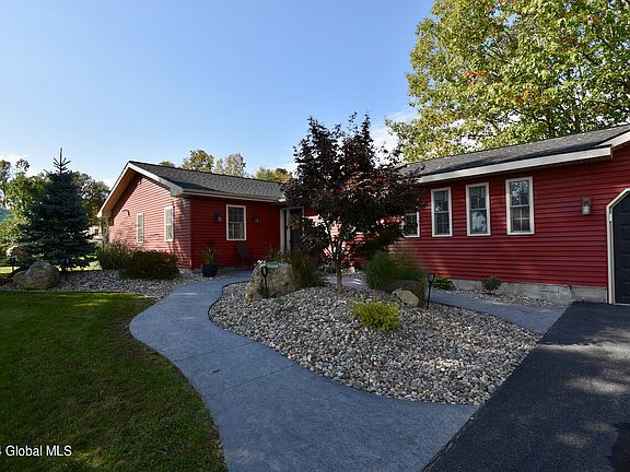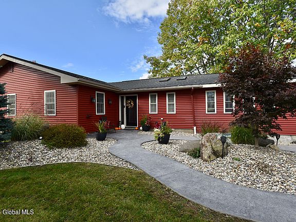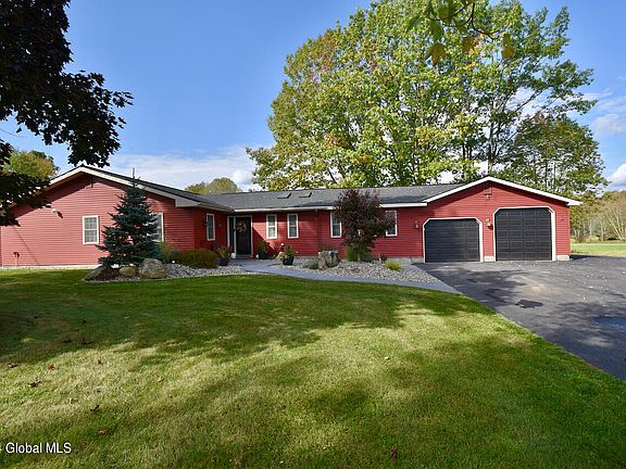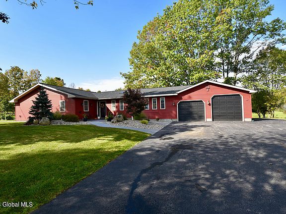 Stunning 2,000 sqft ranch perfectly positioned on an approx 2.5-acre lot with eye catching hardscaping, stamped concrete patio and walkways. Step inside to discover an open floor plan, updated kitchen with ample counter space, SS appliances & breakfast bar. Living room is highlighted by a cultured stone accent wall and sliding glass door that opens to the sprawling backyard. The spacious primary, with tiled bath and versatile bonus room that could serve as a nursey or home office. All updates were completed within the last 3 years and include roof, leach field, well pump, LVT flooring, tiled bath, driveway, slider, furnace, A/C on demand hot water, in floor radiant. Hobbyists dream with 2 car heated garage with 9ft doors, with additional storage off the back. Burnt hills Schools!