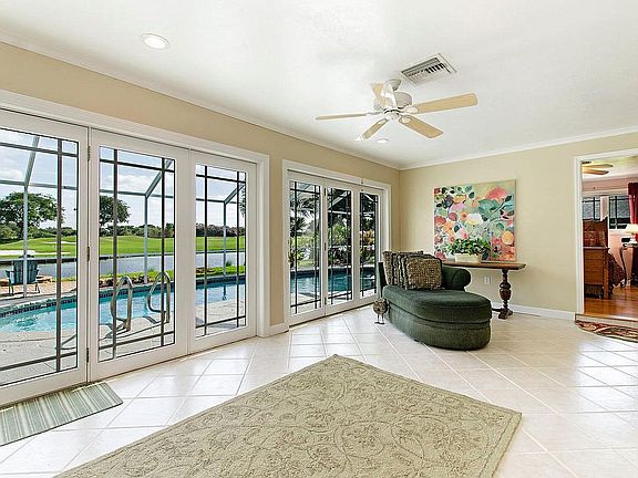 You can have it all with this home. It offers spectacular golf and lake views AND a neighborhood with excellent schools! Home is located on La Playa’s beautiful signature #1 green. Interior features foyer, wood flooring, solid cherry cabinets, tray ceilings, crown moldings, etched glass pocket doors, built-ins. Lg lanai is newly screened with expansive views perfect for outside activities. Enjoy 36’ ft pool with graduated shallow end, children’s fence included. Brick paver walkway leads to patio w/built-in fire pit. Oversized two car attached garage with built-in cabinetry, and attached shed for garden/landscape storage needs. Gated toddler or pet area on side of house, plenty of room for a jungle gym. Upgraded hurricane-rated windows and doors, shutters included. Golfview Drive is a loop off of Cypress Rd East-very private road. Sunrise/sunsets are fantastic over the lake.