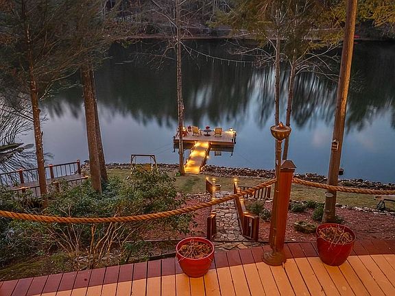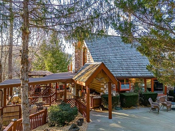 Ever dream of owning an authentic log mountain lodge, nestled on 1.52 private acres with shared ownership in a beautiful private lake? This comfortable cabin-style home is customized for easy living, plus plenty of room for entertaining a crowd. Originally 3 bedrooms with 3 full baths, one BR is currently used for a lady's dream closet/office combination, plus a loft overlooking the great room. Modern kitchen with high-end appliances, generous island, and leathered granite countertops. Extensive covered porches, and multi-level decks for relaxing. Two of five fireplaces are outdoors, one woodburning surrounded by comfortable seating. Views of the stocked lake from every level including your own private dock for fishing or launching a kayak/canoe. An outdoor chef's kitchen with a built-in stainless grill, wide counters, and storage cabinets. Detached two-car garage with workshop. For the hunter, abundant wildlife is nearby. Short-term rentals are allowed.