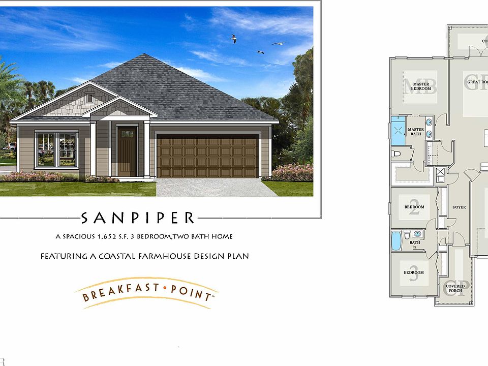 NEW CONSTRUCTION - Panama City Beach's desired Breakfast Point subdivision built by Southern Coastal Homes. INTERIOR features of this coastal inspired home offer a private Foyer entrance, large volume great room with an open floor plan, kitchen with center island, custom cabinetry with soft close drawers & stainless steel appliances, master suite with tray ceiling, tile shower, double vanity & large walk-in closet. Guest bedrooms with access to full bath, dining room, & laundry room. EXTERIOR of this home features a 2-car garage, covered porches in the front & back, fully sodded yard with sprinkler system.