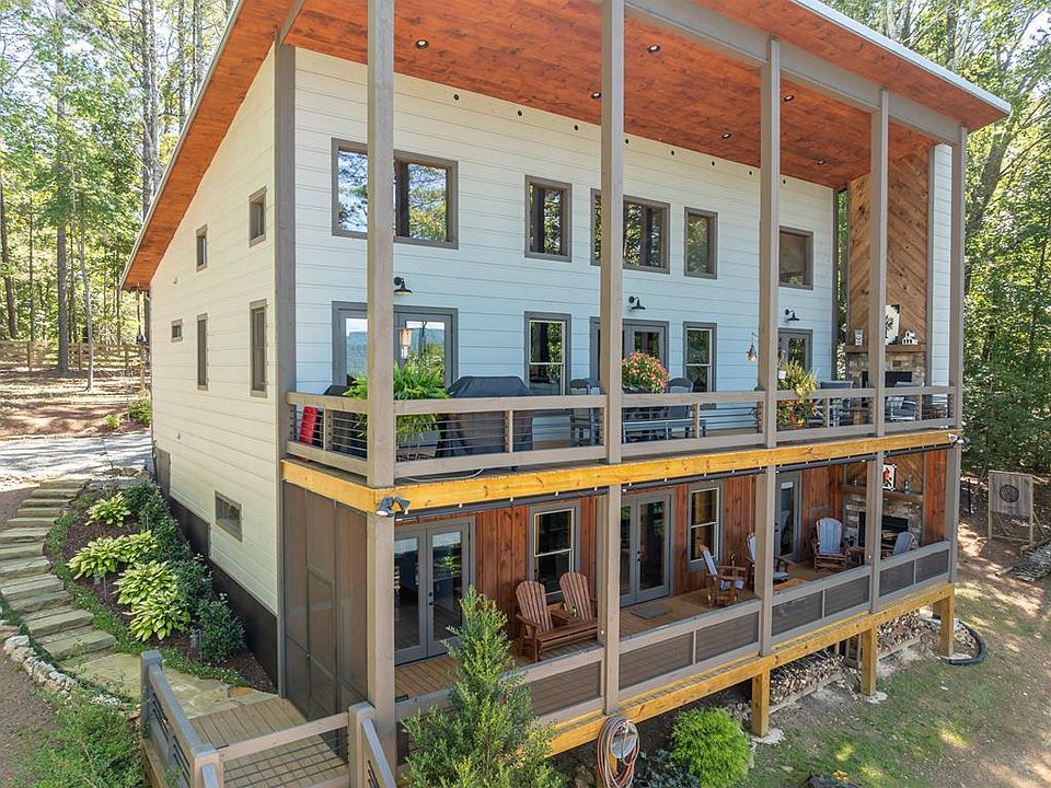Welcome to your fully furnished mountain modern retreat in the coveted Aska Adventure Area near the Toccoa River and Lake Blue Ridge. This stunning 4-bedroom, 4-bath home features an open floor plan with contemporary roof lines, blending rustic charm and modern comfort. Enjoy year-round mountain views from the expansive party deck, complete with two real wood-burning outdoor fireplaces. Inside, natural light floods the space through large windows, showcasing high-end finishes like rustic cabinetry, tile showers, painted wood and shiplap walls, modern industrial lighting, and designer plumbing fixtures. Two beautiful gas log fireplaces inside—one in the great room and another in the terrace-level —add warmth and ambiance. Two bedrooms are on the main level, with two more downstairs that open to a walkout patio. The finished terrace level also includes a spacious recreation room with a wet bar, perfect for entertaining. Notable upgrades: 10' x 12' shed, 14' x 28' garage with reinforced ramp for a vehicle or ATV, underground utilities, fiber-optic internet, zoned HVAC with Ecobee thermostats, 500-gallon buried propane tank, private well with remote-controlled warming lamp, and a fenced yard with electric gate and backyard access. Also included: new Rinnai on-demand water heater, motion detectors, solar programmable switches, drip irrigation, French drains, Trex outdoor furniture, fire pit area with Trex chairs, LED lighting throughout, 20 mini smart plugs (Alexa/phone compatible), plus a Weber grill and Blackstone griddle connected to propane. A dual-fuel Westinghouse generator wired to the home and a remote-controlled car/truck track, easy to remove to provide added convenience. This home perfectly blends luxury, functionality, and breathtaking surroundings.