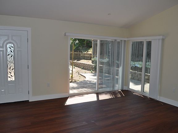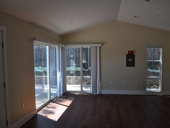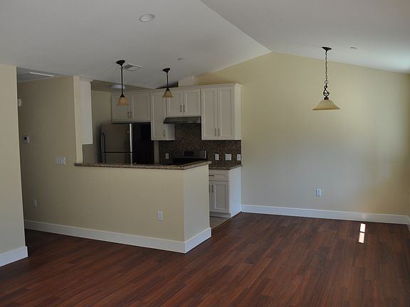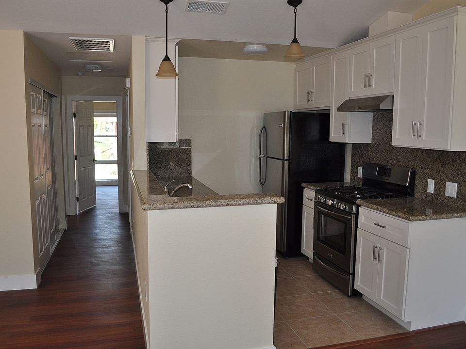 This 2 bedroom 2 bath unit is one of 5 units in complex. Only 1 shared wall with adjacent unit. Vaulted ceilings in living room and dining room. Dual sliding doors in living room which lead out to patio. Kitchen features granite counters, new stainless steel appliances, tile flooring and 5 burner gas stove. Laminate flooring throughout unit with exception of baths and kitchen which are tile. Master bedroom features sliding door to side patio, walk in closet and attached bath with dual vanity sinks, granite counters and custom tile stall shower. Hall bath features granite counters and custom tile tub/ shower combo. Unit also features laundry closet with new full size washer and dryer. 1 parking space. Tenant responsible for utilities. Yard service included in rent. Meridian Property Management Inc. CA Corp DRE Lic#01856665