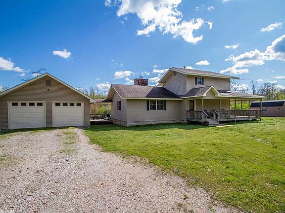 Hidden gem on 2.68 acres! This lovely home has 3 bedrooms (1 downstairs), 2 baths, beautiful wood burning fireplace, wood flooring in living room, large front porch and back deck areas are great for enjoying a little quiet country living! Large 2 car garage attached via breezeway. Full RV hookup located to the left of garage. Storage building and fenced area with small shed. Extra land available for addition price.