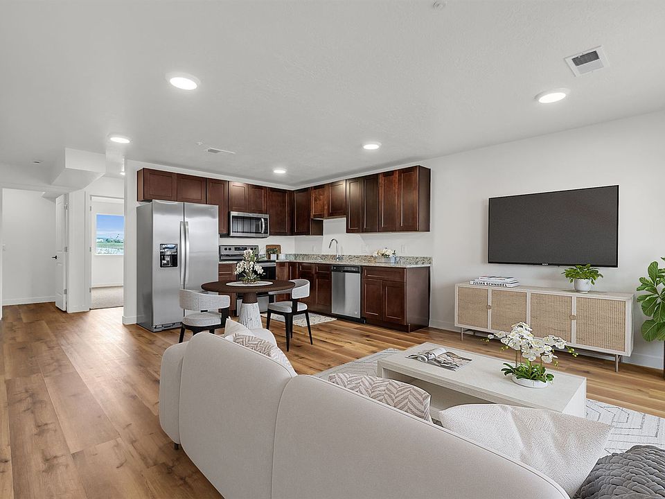 Lowest price of new construction condos in Utah! This is an end unit middle floor and its ready to go. Stainless steel appliances in the kitchen including a **fridge** Luxury vinyl plank throughout with carpet in the bedroom. Monthly HOA fees cover water, sewer, trash, snow removal, park access, a common room, and internet. No parking issues like many other condo complexes. Super convenient location with access to i-15 in 5 minutes. Santaquin is growing with grocery stores, Fiiz, McDonalds, tons of eating options and less than 20 minutes to Costco in Spanish Fork. Easy access to the sand dunes, Santaquin Canyon, and Rowley's Red Barn. Preferred lender incentive of $3000. LOW 1or NO down payment options available. Qualifies for the $20,000 grant. Agents, see attachments for more information on condos.