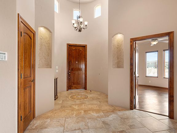 Custom elegance abounds in this 3BDR/3FULL BATHS/3CG plus an office/study on .5 acre lot! Huge great room featuring windows showcasing mountain views, dramatic vigas & kiva fireplace! Radiant heat, backup furnace, RFRIG AIR! Skylights! Lighted Nichos! Gourmet kitchen features beautiful cabinetry, granite, bkfst nook, island, walk-in pantry, 5 burner gas cooktop, wine cooler & refrig. Large secondary bedrooms with Jack-N-Jill baths! Incredible master suite features his/her vanities, snail shower, jetted tub, walk-in closet! 3CG has extra storage area & large rec area! Outdoor shed/saloon/playhouse for even more storage!