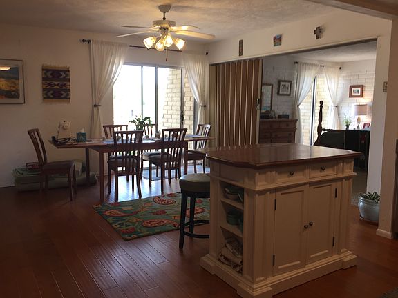 Tremendous red rock and mountain views from the top of the mesa in this recently painted and sturdy slump block home. Tiled 456 sq.ft framed addition. Two bedrooms with walk-in closets and potential to section off more bedrooms if desired. Detached garage with laundry. Newer roof and hot water heater. Huge organic gardening area on lot and a half. Flagstone patios and covered porch on this large, corner lot. Sweet home perfect for starter or retirement. Tons of storage and potential. Electric ceiling heat coils and individual room free-standing heaters. Addition built in 1980. Original home 1967.