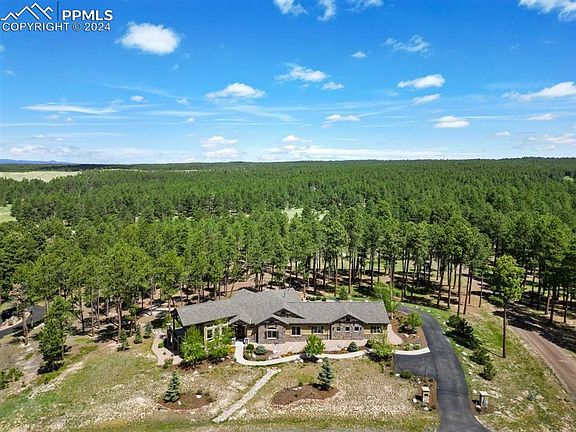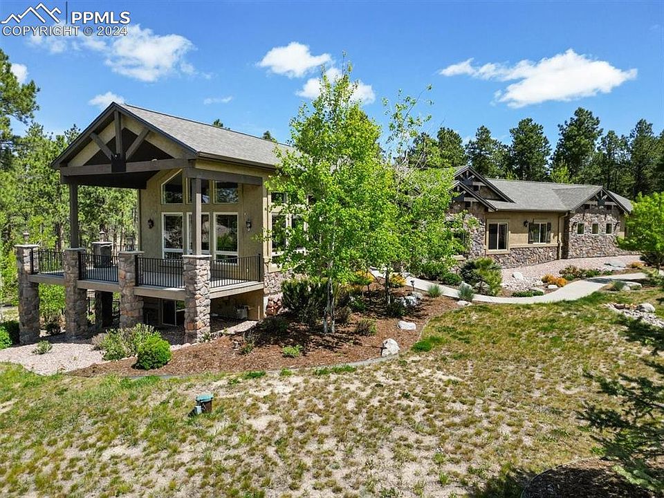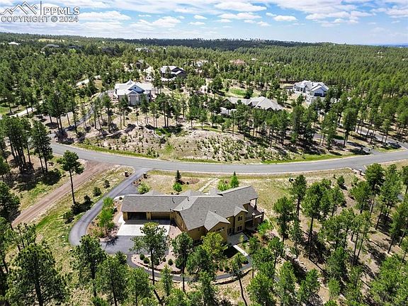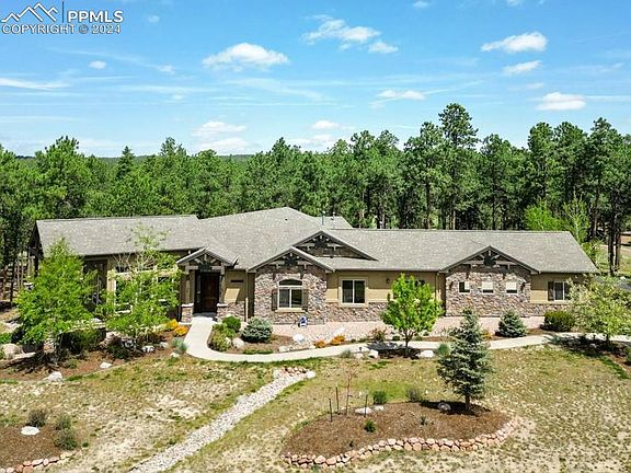 This exquisite custom home, featuring 4 beds, 4 baths, and a 4-car garage, built in 2012, is a single-owner masterpiece. The home features 6-panel doors, soaring 9ft+ ceilings, a great room w/stone wall, gas fireplace w/built-in shelves, offering an open, airy ambiance. The chef’s kitchen is equipped with granite counters, eat-at island w/prep sink, gas cooktop, stainless appliances, and breakfast nook w/access to a wrap-around deck. The large main level primary suite has a luxurious 5-piece bath w/granite double vanity, walk-in shower, jetted soaking tub, two walk-in closets, and access to the laundry room w/built-in cabinets, granite counters, and tile floors. This home is wheelchair/zero entry accessible w/elevator and paved outdoor paths around the property. The ceilings in primary bedroom and garage are reinforced for a Hoyer lift system, if needed. The main level also includes a formal dining room with cove ceilings and an office with large windows, French doors, and built-in cabinets. The walk-out basement has a family room w/stone wall gas FP, full wet bar w/granite counters, a game/workout area, and 2 spacious bedrooms connected by a 4-piece bath. The 4th bed has a walk-in closet and private access to a full bath. Cathedral Pines offers a secluded lifestyle yet minutes away from The Club at Flying Horse, shopping, entertainment, restaurants, and I-25. Featuring over 4 miles of trails, a community lodge, stocked fishing ponds, and is just under 2 miles from the El Paso County Regional Park. The serene environment is complemented by stunning views of Pikes Peak and the surrounding open space. This home combines elegance, comfort, accessibility, and breathtaking natural beauty in a prime location. The spacious kitchen and living areas are perfect for hosting gatherings, while the primary suite offers a tranquil retreat. Outdoor enthusiasts will appreciate the proximity to trails and parks, making it easy to enjoy the natural beauty of Colorado.