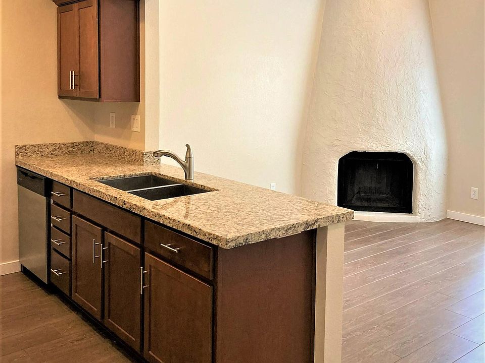 Cozy beehive fireplaceGranite kitchen counter topsStainless appliances