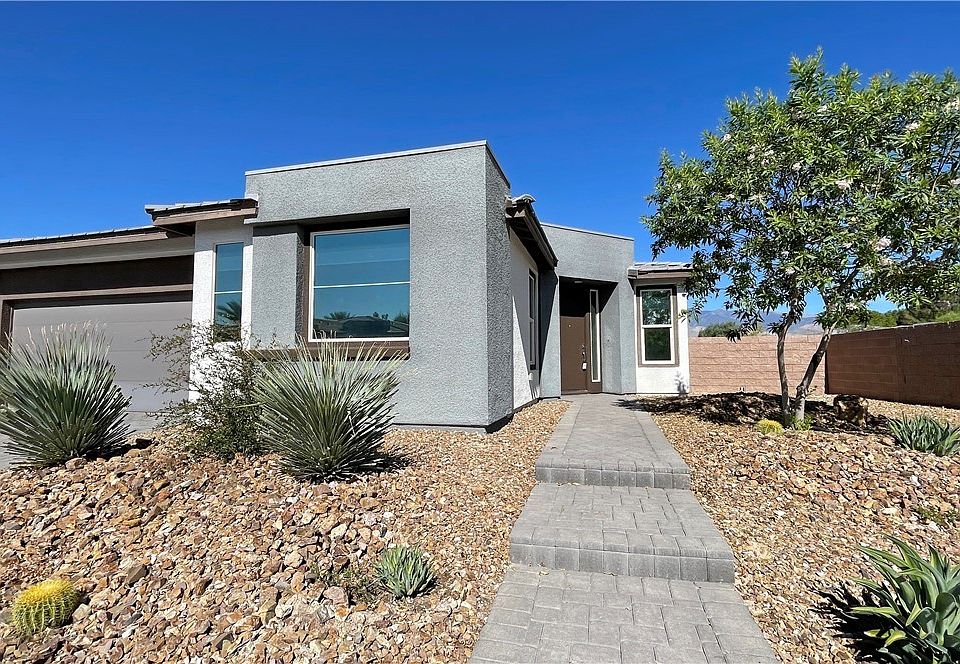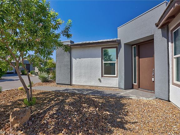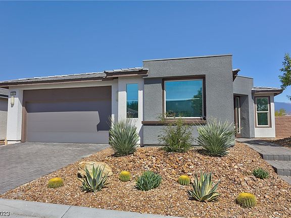 This Ovation/Mtn Falls corner lot home in a gated community boasts tile flooring throughout, a spacious living area with a 3-panel slider to a charming patio and stunning mountain views. The modern kitchen features stainless steel appliances with an induction range, granite countertops, and oversized tile flooring. Roller shades adorn the windows, and the landscaping is meticulous. The primary suite offers dual sinks, a walk-in shower, and separation from the other bedroom. Outdoors, there's a covered patio, extended pavers, and landscaped trees/shrubs on drip irrigation with a timer, all with a fully-fenced backyard and a view of snow-capped Mt. Charleston. This 2-bed+den, 3-bath home with a 2-car garage spans 1,723 sqft. The area offers 3 golf courses, 3 wineries, gaming, and ample trails for outdoor adventures. Just a 45-minute drive to Las Vegas!