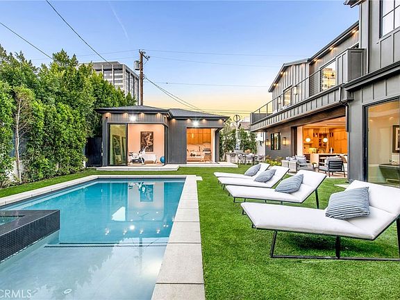 Striking new construction Modern Farmhouse with manicured gardens, natural wood shingle siding, wide plank wood floors, and clean architectural lines. Inside you are greeted with a missive open floor plan with a formal living room with fireplace and entertainment bar adjacent to an elegant formal dining room with designer lighting and built-in buffet. A gourmet Chef’s kitchen with wood cabinetry, wood-wrapped range hood, stainless steel appliances, built-in refrigerator, walk-in pantry, and island with waterfall counter, prep sink, and breakfast bar overlooking the inviting family room with fireplace and pocket doors to an outdoor Entertainer's dream backyard. The downstairs suite enjoys a stunning bath with floor to ceiling tile. An elegant powder room with wood and stone vanity completes the main floor. Upstairs, the romantic master suite boasts a fireplace, wood-beamed ceilings, oversized private balcony, incredible walk-in closet, and spa-like master bath with dual vanities, contemporary soaking tub, and standing glass rain shower. Entertainer’s yard with sparkling pool, infinity spa, BBQ center, and 2 Bed 1 Bath Adu complete with a kitchen. Additional conveniences include a 2 car garage, state of the art Control 4 smart home system with added home security. Experience everything Encino has to offer, located near fine dining, shopping, and more.