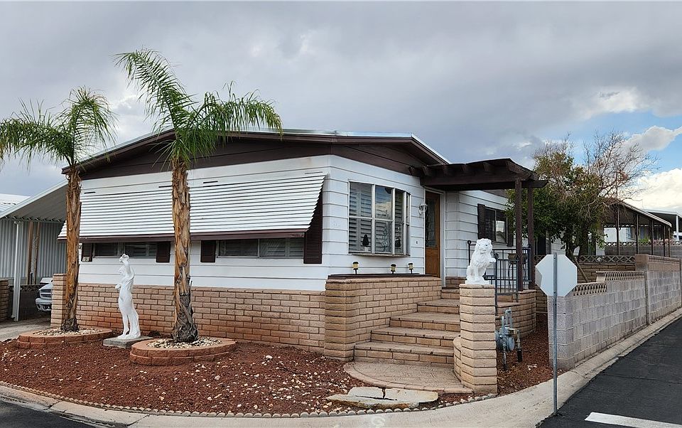 Great Location and Private Community! Age-restricted community (55+). The home includes 2 beds and 2 baths, a living room, a dining area, a kitchen with black appliances, a pantry, a breakfast bar, and a garden window. The primary bedroom is spacious and the bathroom has dual sinks and a large separate tub. The second bedroom is connected to the second bath which is a nice feature. Heading outside, the home is on a corner lot and has a large covered patio, and a large separate shed under the awning of the home with a swamp cooler already installed. Royal Ridge is a quiet community with nearby access to shopping, freeways, and the Las Vegas strip. This community is gated for that extra security. Royal Ridge is all about community socials and residents enjoy the community pool and spa, clubhouse, exercise room, and tennis court. Don't miss out on this one!