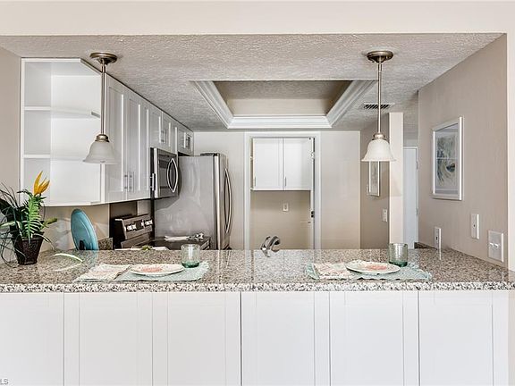 This is the vacation condo you were waiting for !! Bright, light ,contemporary and all the updates have been done so you can be ready for next season. The entire kitchen and baths have new cabinets. This coastal dream has all new white wood, shaker cabinets with soft closers with European door hardware and chrome door hinges. The new counters in kitchen and baths are Brazilian granite in light multi flecked gray and white tones. The new appliances are stainless Samsung with French door fridge, dishwasher with stainless interior and custom stainless back splash at the stove. The kitchen is highlighted by new lighting at recessed ceiling with crown molding, dimmable led lighting and new pendants at the wide breakfast bar. All new cabinets in both baths with all new tile floors and custom master shower with river rock tile floor and heavy tempered glass frameless shower door. This Florida dream condo also features light maple faux wood floors, all new 5 and 1/4 baseboards. This is boating at your door step! View the gulf access canal and enjoy entertaining along the extended tiled lanai with pulldown shutters. Great location for walking to restaurants and shops. age restricted comm.
