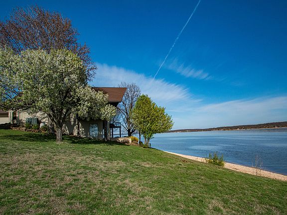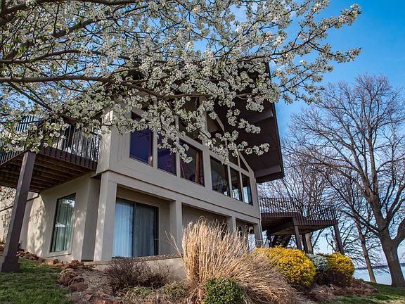 Fabulous waterfront home in the charming gated community of Two Tree Island Estates. Enjoy huge lake views from this South facing home. This wonderful home is surrounded by mature trees, landscaped yard that leads you to a gentle gravel beach front. Perfect lake home for the entire family. Relax and enjoy your day on the gravel beach front, the lower patio, 2nd level deck or step inside and enjoy the lake views from almost every room in the house. Open floor plan features great room with living, kitchen and dining areas, wall of windows, vaulted ceiling, wood burning fireplace, beautiful wood floors, large eating bar divides the kitchen and dining area, new granite counter top and backsplash, tile floor, lots of storage including a huge pantry.Master suite on main level, lake views, deck access, spacious room with cove ceiling, en suite features granite top double vanity, ceramic tile shower, corner whirlpool tub, and his and her closets. Lower level features an awesome theater room, a special treat for family and friends, enjoy movie night in the 8 theater seats. Guest rooms are also located on the lower level. Guest bedrooms 2 & 3 with a full bath between. Charming studio apartment, single room for living, kitchen and bedroom. Full bath features tub shower combo and double vanity. Upper level loft overlooks the living area, great natural light, full bath with tub shower combo, bonus room is perfect that 4th guest bedroom. You can also access the attic over the garage from this bonus room. Home also includes 1 & 1/2 lots, 2 boat slips & jet ski slip in community boat dock, slip #4 12'x28', slip #10 12'x32', jet ski float, #30 11'x11'. Lake water irrigation system, bug spray system, Trex decking, new roof in 2011, intercom system inside and out on the deck, new kitchen appliances, new granite counter top, electric hot water tanks x 2, multi zone heat and air,