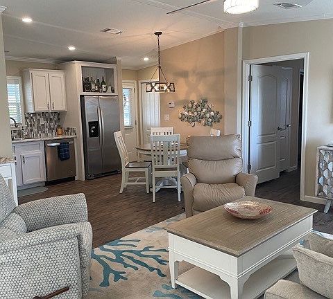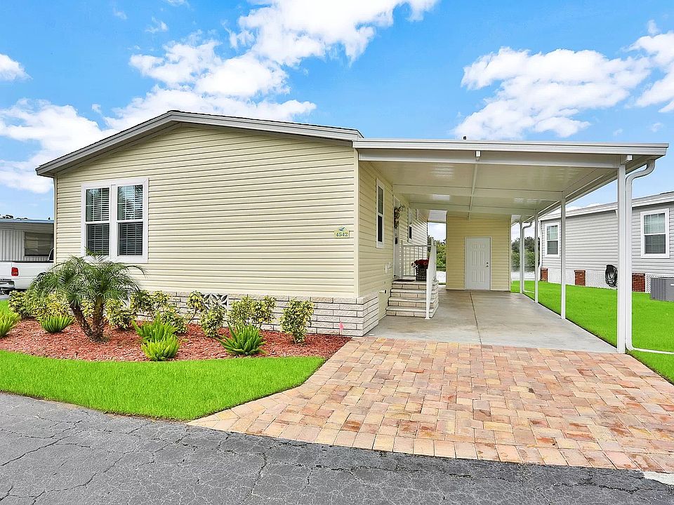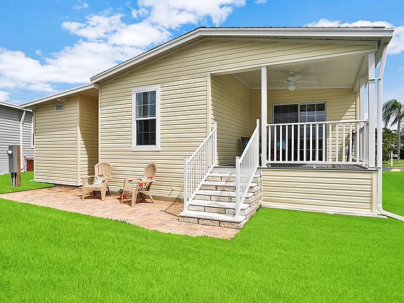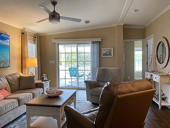 This beautiful 2/2 split floor plan Champion home features a designer kitchen with beautifully upgraded cabinets, a mosaic backsplash, stainless appliances, pull-down faucet and recessed lighting. With beautiful flooring throughout, the wide-open floor plan offers open living and entertaining space. Upgraded ceiling fans in living room and master bedroom. The master features a gorgeous ensuite with double sink, marble ceramic tile with corner seat, glass doors, rainforest shower head and linen pantry for all the extras! The guest bedroom overlooks the lake, and guest bath boasts of sky light (solar tube), tub/shower and upgraded vanity. Walk out the sliding glass doors onto the 11.8x11.9 composite deck covered porch with an outdoor ceiling fan that overlooks the lake and fountains. Sit and relax as you gather in the afternoon sun to watch the fish, turtles and birds. The porch also includes privacy shades. The lake fountains are lit at night displaying a rainbow of color. Walk from the porch to your paver patio and soak up the sun in the privacy of your lakeside COTTAGE! This home is located in Waterside Club, an active 55 community conveniently located to shops, dining, entertainment, fishing, boating, golf, medical facilities and airport. Waterside Club is less than 20 minutes to all local beaches including Anna Marie Island. Waterside Club offers a heated pool, pickle ball, shuffleboard, billiards, library, fitness center, computer lab and a beautiful sundeck overlooking Waterside's Heron Lake. Waterside Club is pet friendly with two pets 40 lbs and under. Call today for your tour of this beautiful home and active 55 community!