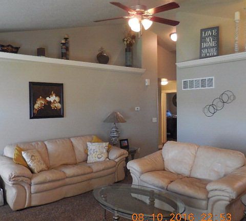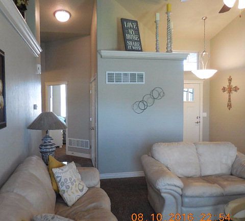 Parade Home in 2013 and has many upgrades to both exterior and interior. This home offers 3 bedrooms, 2 baths on the main floor. The entry and front bedroom have 11 ft ceilings. The master bath has a separate tub/shower and double sinks. The pantry is a huge walk in that looks like part of the cabinets. Custom Cabinets, tile, granite counter-tops, and upgraded splash boards, double oven and upgraded appliances all compliment the open kitchen. Other features inside are upgraded faucets, toilets, shower door, and cupboards above laundry. Exterior offers full vinyl fencing, covered patio, stamped concrete curbing, Stone from ground to eves on entire front for great curb appeal. This house is part of a subdivision that has walking paths and parks throughout. Based on no Home Owner's Exemption, Seller is willing to negotiate Value/Difference until Home Owner Exemption applies.