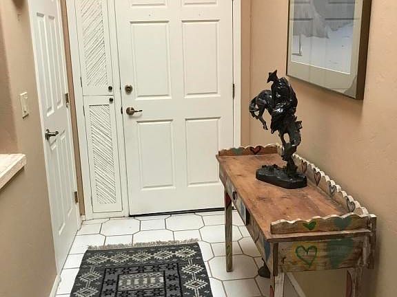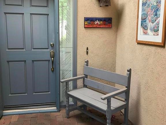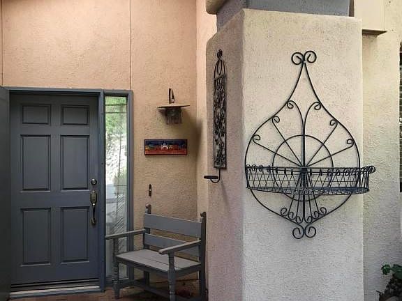 Gated Kachina Hill. A very popular community nestled in the Tucson Foothills. Ambiance everywhere. 1042 sq ft TH. 2 bedroom 1.5 Bath. Second bedroom has no closet. Fireplace in living room, vaulted wood ceilings in living room, dining room, eat-in kitchen has tiled counters. Bathrooms have corian counters. French doors lead to patios. Leaded glass touches. Lushly planted patios with mountain views. Borders common area to the north. Close to heated community pool and spa. Convenient to La Encantada shopping and popular Sabino Canyon Recreations. Fountain does not work. Submit all offers.
