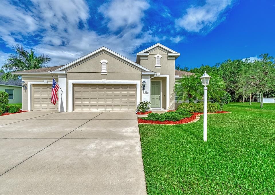 Welcome to your dream home in the highly desired Sugar Mill Lakes community! This delightful 3 bedroom, 2 bathroom residence includes a bonus sunny office currently used as a formal dining room, offering flexibility to suit your lifestyle. The spacious 3-car garage ensures ample storage and parking space. Inside, you'll find beautiful laminate flooring in the primary bedroom and office, while the rest of the home features stylish 18” tile and cozy carpet in the guest bedrooms. There is an airy, open floorplan leading you through the home where you find the kitchen in the center, featuring shaker-style cabinetry, stainless steel appliances, granite countertops, unique tile backsplash, pendant lighting and a massive center island/breakfast bar where you can drink your morning coffee as you start the day. Overlooking the expansive dining and living areas, this will be the ultimate flex space for entertaining guests at your next gathering! The primary bedroom is your own personal retreat, featuring a generously sized walk-in closet and an en-suite bathroom equipped with his and her sinks, a relaxing garden tub, and a walk-in shower, perfect for unwinding after long days. Adjacent to the kitchen and living areas there are two more bedrooms and a shared bath, perfect for overnight guests or a big family. Outside, the expansive lot, nearly a quarter of an acre, features lush landscaping and no rear neighbors, offering added privacy and tranquility. Spend your evenings on the newly screened-in lanai, watching sunsets with a glass of wine in hand. The home is enhanced with tray ceilings in the living room & primary bedroom and stunning glass French doors in the front office. Additional improvements include the new gutters and a 6x10 stick-built utility building at the back of the garage for extra storage. Sugar Mill Lakes is a quiet community with low HOA dues, a park, a playground, and tennis courts to assist in keeping up an active lifestyle. Centrally located, close to all of the essentials and only 30 minutes from the pristine sandy beaches of Bradenton! Don't miss this opportunity to own a beautifully upgraded home with all the space and amenities you need. Schedule your showing today before it's gone!