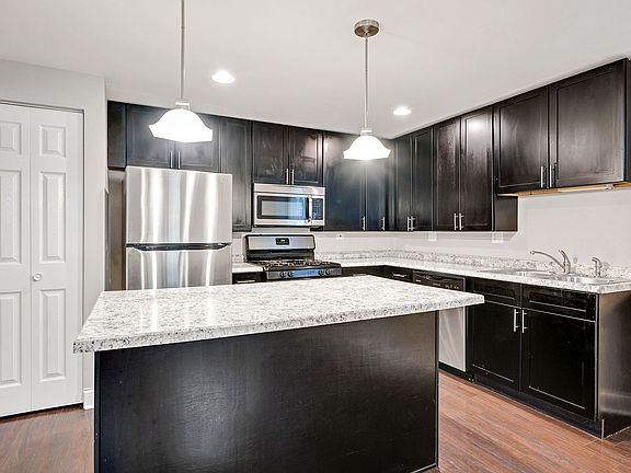 The modern kitchen is equipped with sleek black cabinetry, stainless steel appliances, and a center islandideal for meal prep and casual dining. Enjoy the convenience of an in-unit laundry room with a washer and dryer included.