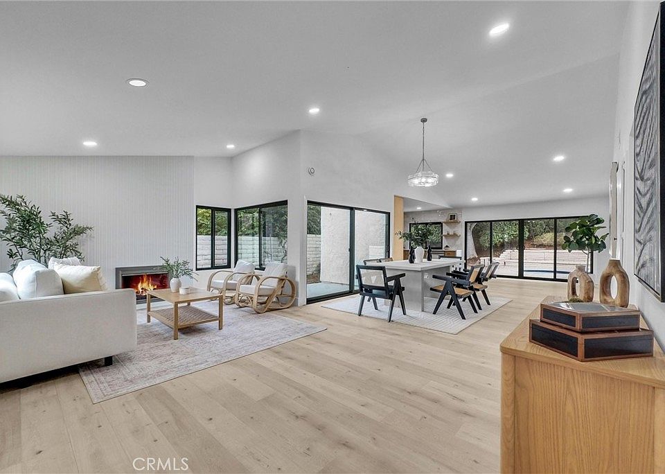 The spacious living room centers around a welcoming fireplace, flowing into a generous dining area and gourmet kitchen. The kitchen features stainless steel appliances, including a commercial-style gas range and drawer microwave, complemented by light oak shaker cabinetry, quartz countertops, and porcelain tile backsplash. Light oak plank laminate flooring and recessed lighting enhance the modern aesthetic throughout.