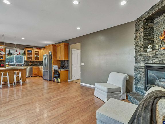 The family room offers a stone fireplace and is open to the eating area and kitchen. The kitchen boasts newer stainless steel appliances, granite counters, and a breakfast bar. Rec room w/French doors perfect for a pool table or movie room. New roof in 2021 and new carpets. Primary has a walk-in closet, jetted soaking tub, and a separate walk-in shower. Office/den for the work-at-home. The garage has drive-through doors for access to the 20x20 shop. Fenced backyard. New water heater installed 10/22