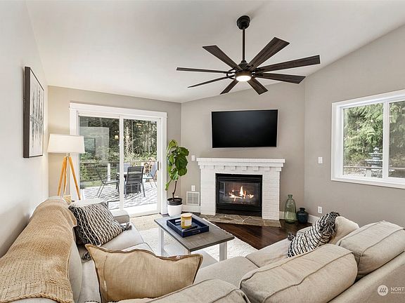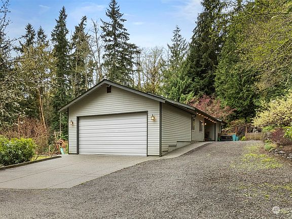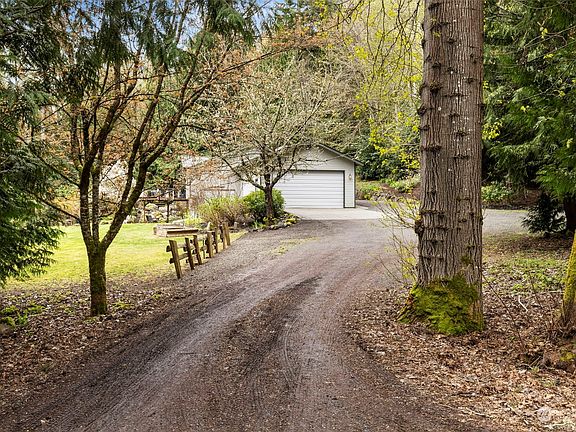 A private oasis surrounded by woods, minutes to town and ferries. The sunny lot makes enjoying the acreage a treat. Spacious decks & patios, fountain & firepit, even a chicken coop! It's a prime spot for NW living. Easy flow interior offers many options. Main floor living w/beautiful hardwood floors that flow through the great room, dining area, primary suite & 2nd bedroom/office. Nicely updated kitchen and beautiful full bath. Vaulted ceilings, cozy gas insert & slider to wrap around deck perfect the main level. The oversize, walk-out family room downstairs, spacious 1/2 BA, bonus room w/French doors & a bedroom with walk in closet, offer lots of options. Don't miss the huge bonus space attached to the 2 car garage. Generator hookup too.