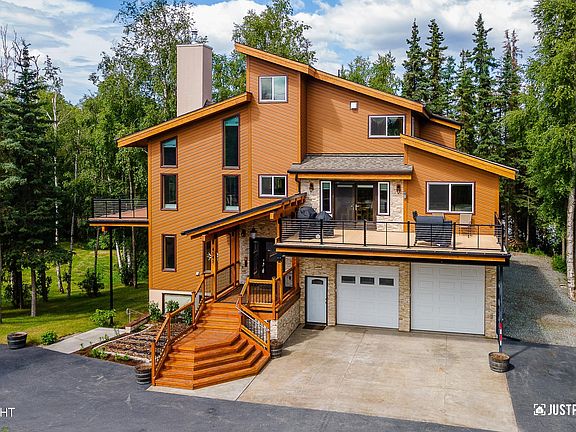 Custom hillside home situated on a park-like, 1.75-acre lot! Features include vaulted ceilings, generously sized bedrooms, and granite countertops in the kitchen and bathrooms. The incredible chef's kitchen has a butler's pantry, massive center island with prep sink, and stainless steel appliances. The primary bedroom is on its own floor with a beautiful ensuite and easy access to the loft office/ loft office/bonus room. This home has tons of storage throughout (including the hidden room in the primary bedroom!). The in-law apartment is nearly 800 SF, 1BR 1BA with its own entrance and laundry. A large circle driveway provides plenty of parking for all of your Alaskan toys. The attached 32x26 ft garage with one standard plus one oversize automatic door. Plenty of room to park your vehicles and still have workshop space, or pull in your camper! The home is zoned for horses and has the option of a second driveway from Pacer Pl.