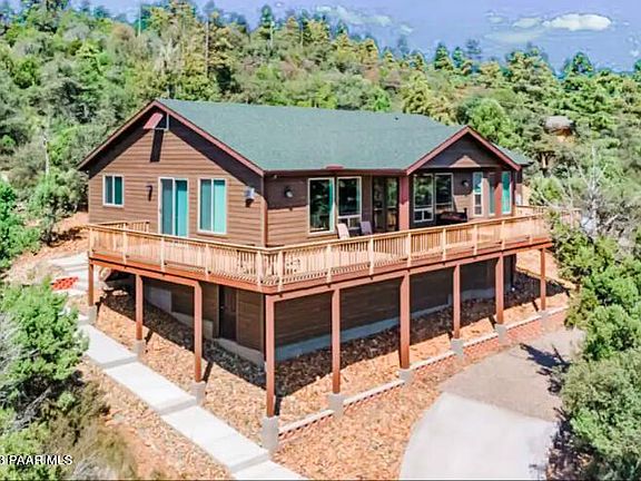 Pristine custom built cabin with panoramic views of Prescott National Forest! This mountain getaway has 3 bedrooms and 2 1/2 baths, open concept great room with gorgeous tongue and groove ceilings, a cozy fireplace, and views forever! Stainless steel appliances in the kitchen, beautiful granite counter tops, and Alder wood cabinetry. This split floorplan has the primary bedroom off to the right; this retreat offers amazing views and a beautiful bathroom with granite counters, and a walk in closet. The large mudroom has ample storage, a utility sink, and the washer and dryer are included in the sale. You will fall in love with the views from the 50 foot wraparound Trex deck with a covered portion for year round use.