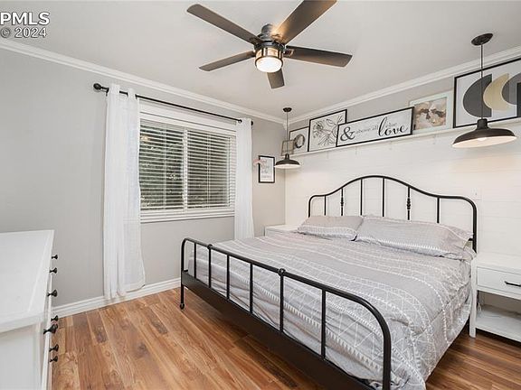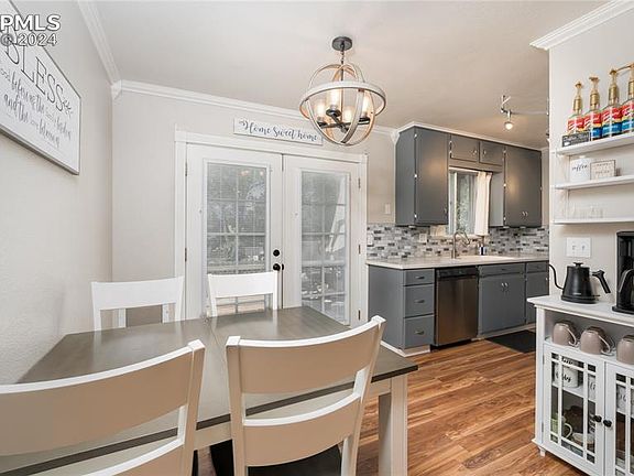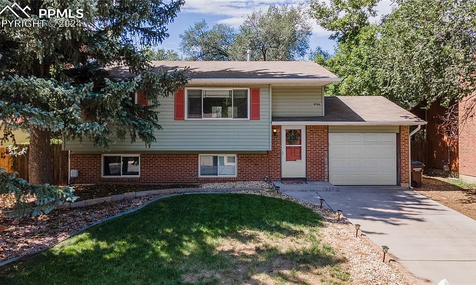 Welcome to this sweet Vista Grande home with custom updates throughout. A fun deco tile welcomes you at the entry, with space for a little drop zone and access to the garage. Wood-look laminate floor graces much of the main living level. Enjoy shiplap wall at main bedroom and accent paint walls in second bedroom and main bath. Sweet space for the coffee station adjoining the eating area plus a kitchen updated with beautifully painted cabinets, Corian counters and stainless appliances. Pick your master either upstairs near 2nd bedroom, or down with an adjoining bath. Bathrooms both have some updates at the vanities, lighting, and plumbing fixtures. The lower level family room has a painted brick wood-burning fireplace with custom mantle, and includes ample room for gathering and setting up a home office space or play area. Outdoors, appreciate a 20x10 deck, 13x19 pavestone patio, fantastic lot with mature trees, updated landscaping with ample grass to play in the yard, as well as a 12x8 working shed and metal storage shed! Tucked on a quieter street with quick access to Academy or Austin Bluffs means a quick access to commutes all over town. Welcome Home!