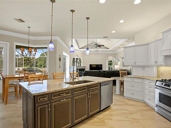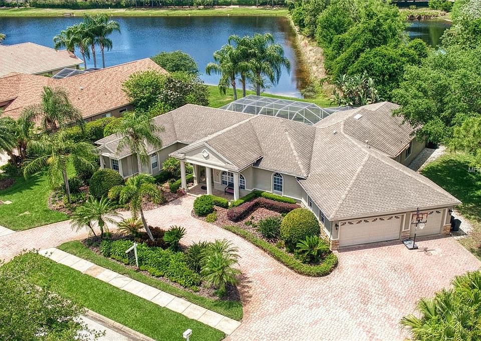 Price reduced! Incomparably located in sought after Lansbrook on nearly ¾ acre lot combining private conservation & western waterfront exposures, welcome to this magnificent 4 bed, den & 3 bath pool home. Unique side load 3 car garage accessed through a massive circular brick paved driveway featuring professional landscaping & exterior accent lighting. Through double etched glass doors step onto stunning Brazilian cherry wood floors. Take notice of superior construction & architectural detail throughout including coffered ceilings foyer, sleek crown molding almost everywhere & plantation shutters. Executives will appreciate custom office, w/built-in desk, cabinets & accent lighting. Stunning new kitchen graced w/tile floors throughout the family room all new in 2019. Enjoy gorgeous granite tops, stainless appliances, built-in buffet, breakfast bar, eat-in area with mitered window & pocketing sliders out to lanai. Large owners suite features Brazillian wood floors, two walk-in closets, travertine marble dual vanities & jetted tub. Generous sized bedrooms but the 3rd bedroom is massive. Could be a bonus room or home theatre. Family will enjoy the large covered lanai with wet bar viewing waterfall heated salt pool & sunsets over the pond. Walking distance to Lansbrook private Lake Tarpon park, boat ramp & day slips or additional private park with basketball courts. Lansbrook Golf Course & Ymca located on property have extra fees. Great schools & very close to John Chestnut Park, bike trails and beaches.
