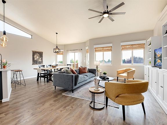 Welcome to this adorable updated ranch-style home nestled in the highly sought-after Enchantment Ridge neighborhood. Enjoy the spacious covered front porch with full morning shade, while the back deck boasts afternoon shade and expansive views of the Eastern Plains. Step inside to a light and bright open great room featuring newer luxury vinyl plank flooring, perfect for hosting gatherings. The large living area boasts built-in cabinets, vaulted ceilings, and a modern fan. The updated kitchen is a chef's dream with painted cabinets, quartz countertops, and newer stainless steel appliances. Lovely modern lighting illuminates the space. Retreat to the sizable primary bedroom with attached en suite bathroom featuring a soaking tub, standalone shower, and double sinks. Two additional bedrooms and a remodeled bathroom complete the main level. The fully finished basement offers a large rec room, two additional bedrooms, ideal for an office and guest suite, and a newly added beautiful bathroom. Step outside to the flat and usable backyard with a walkout basement and enjoy your upper deck with a bit of privacy provided by hacking up to the neighborhood green space and basketball court. Plenty of room for playing, gardening, and enjoying the Colorado weather! Additional features of the home include all new interior paint, gig speed fiber internet, hot tub, and LED light fixtures/ceiling fans. A brand-new high efficiency HVAC system with heat pump ensures comfort year-round. The location is great! Under 10 minutes to countless hiking trails and approximately 15 minutes to the winery and entrance to Thompson Canyon. Adjacent natural area set to open in 2025, connecting to popular biking and hiking trails like Devil's Backbone. Don't miss out on this opportunity to own a home in a neighborhood with a walking path offering gorgeous views of the foothills and surrounding natural areas while being only minutes to downtown Loveland. Buyer backed out due to personal circumstances.