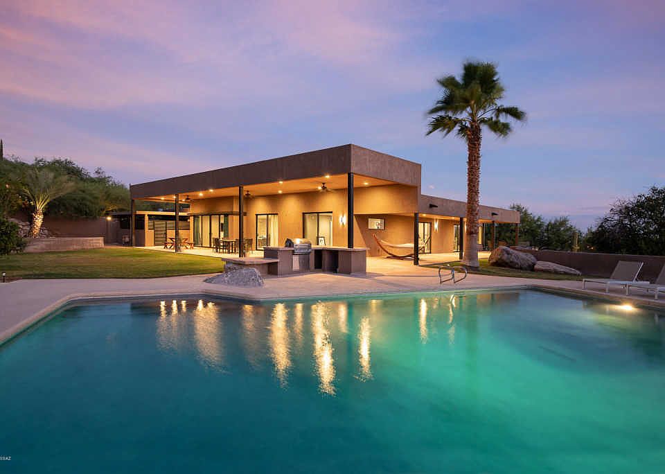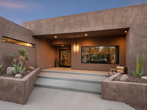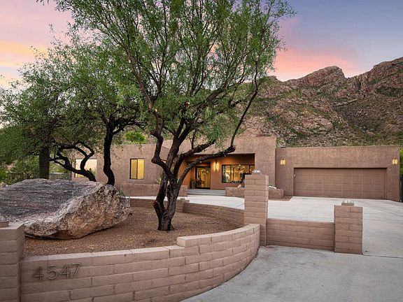 This entertainer's dream home, complete with guest house, received a full upscale renovation in 2018. The ideal north-south private lot is nestled in the foothills of the Catalina Mountains, offering unparalleled city light and mountain views. A custom pivoting glass front door welcomes you to spacious open concept layout, and floor-to-ceiling glass across the back of the home provides an abundance of natural light and mountain views. The gourmet kitchen offers Caesarstone counters, stainless appliances, induction stove-top, walk-in pantry, wine fridge and separate ice maker! The split floorplan includes dual master suites and 2 guest bedrooms. The main owner's suite offer a spa-like bath, a walk-in closet, twinkling city light views, and a private covered patio. The gorgeously updated