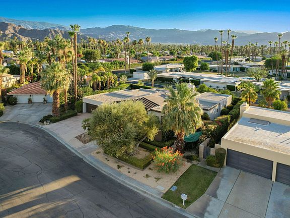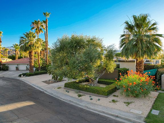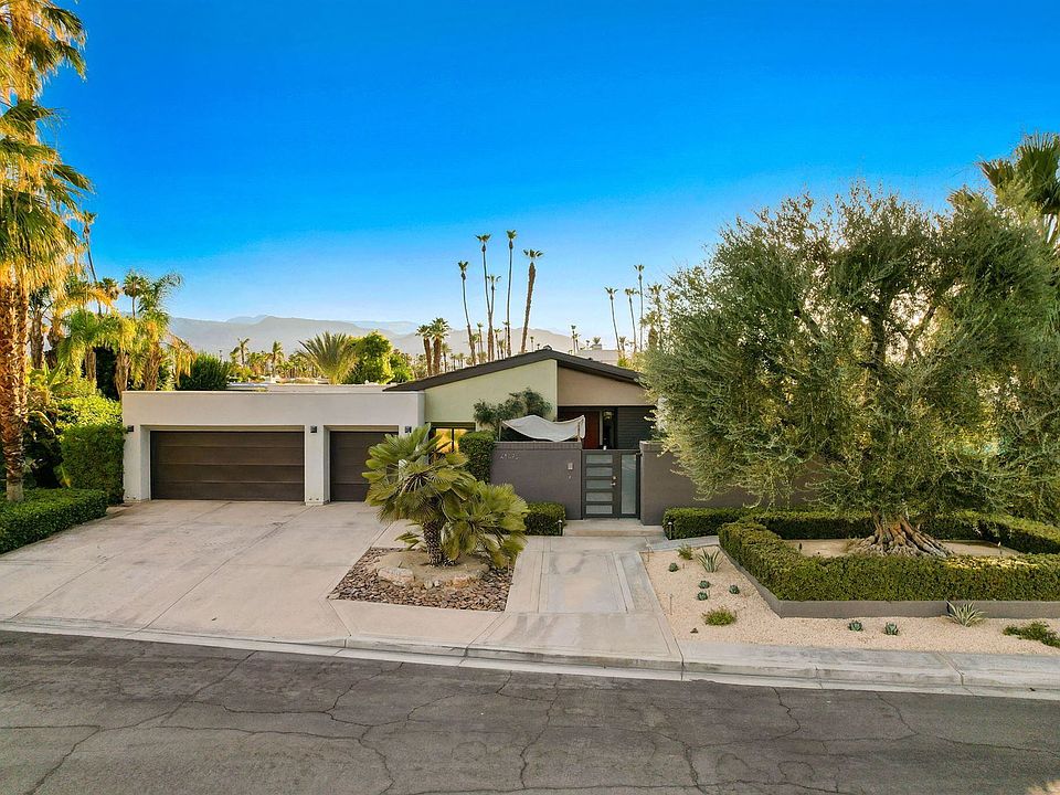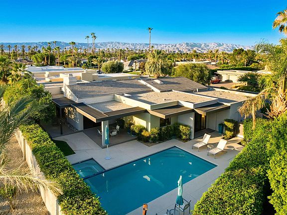 Clean architectural lines define this contemporary-style home in sought-after Indian Wells. From the vaulted wood ceiling in the great room to the sparkling rectangular pool the aesthetics and flow are all about easy, relaxed living. The gated entry courtyard with fountain welcomes you to the light-filled chic interior. A beautiful stone fireplace accentuates the great room, and the fabulous step down bar adds a touch of mod flair to the space. Sliders lead to the spacious backyard with ample room to relax or entertain, and makes for seamless indoor/outdoor living. The inviting pool and spa are accented by blue David Hockney tile. The beautifully landscaped yard offers views to the mountains and an array of citrus trees. Back inside, the kitchen is off the den, or make it your breakfast room, and offers a great space for the avid cook with Sub-Zero column refrigerator and freezer, a large peninsula with seating for guests and a slider to the patio. The primary suite is a private oasis with a large ensuite bath, two walk-in closets and a slider to the patio and pool. There are three additional spacious bedrooms with ensuite baths. A separate laundry room and a two car garage with epoxy floor, golf cart garage and mini-split round out this perfect desert home. This is a meticulously maintained property ready to welcome its new owner. No HOA.
